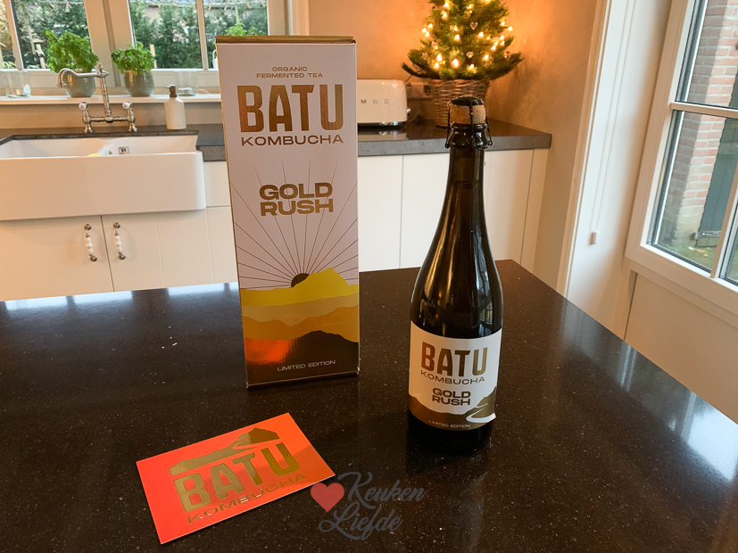 Vandaag sta ik in de keuken om een aantal recepten voor KL te maken. Tussendoor komt er nog foodpost binnen: een prachtige fles kombucha van BATU. Deze limited edition Gold Rush zit in een champagnefles en is met de hand afgevuld met 24 karaats bladgoud. Chique de friemel! Heb hem nog niet open gemaakt want ik wacht even een mooi moment af. Voor het avondeten gooide ik aardappels en spruitjes in de oven, bakte wat spekjes uit en bakte tartaartjes.