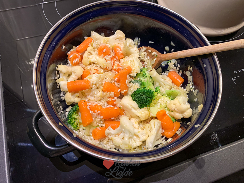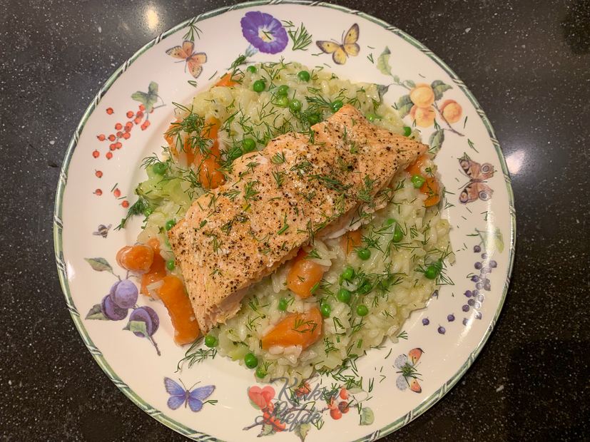 Vandaag staat er risotto op het menu. Ik voegde een zak gesneden groenten toe met broccoli, bloemkool en wortel. De wortel had ik kleiner gesneden maar aan het eind van de bereidingstijd waren de broccoli en bloemkool zacht en de wortel nog niet. Volgende keer dus de wortel dus nog kleiner snijden. Op het laatst gooide ik ook nog een handje diepvriesdoperwten bij de risotto. Ik ben dol op die knapperige erwtjes. Ondertussen gaarde ik een mooi stuk zalm in de oven om erbij te serveren, ongeveer 10 minuten (afhankelijk van de dikte) in een voorverwarmde oven op 200 graden. Ondanks de wat harde worteltjes was het een heerlijke maaltijd.