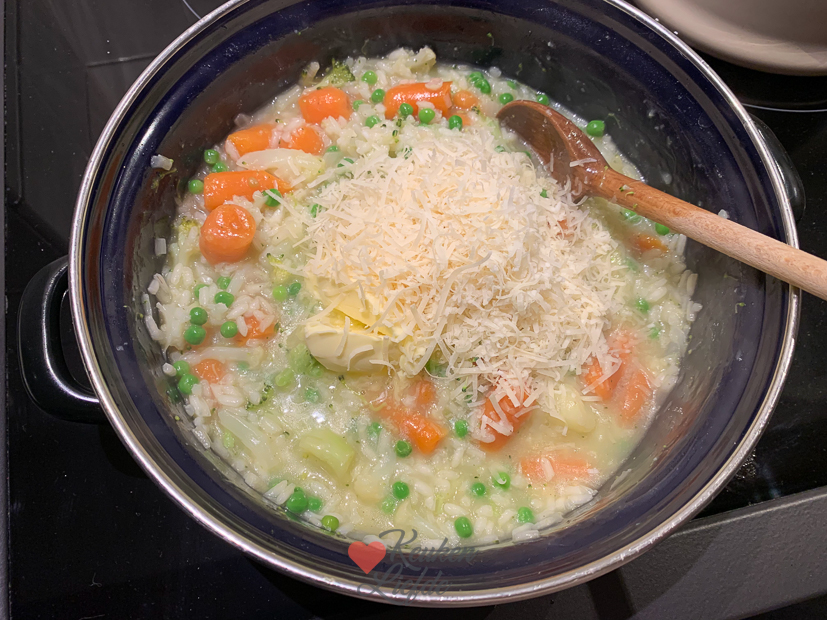 - Beetje roomboter en Parmezaan door de risotto roeren en nog heel even in een afgesloten pan laten rusten. Dan lekker opscheppen.