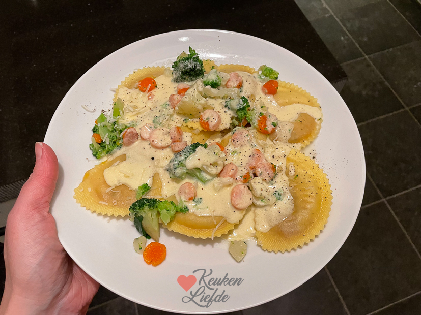 Ons weekend was heel rommelig en chaotisch. Omdat de slaapkamer van Ella leeggepakt is staan boven overal spullen en slaapt Ella tijdelijk bij ons op de slaapkamer. We kunnen nergens bij en overal ligt rommel! Aaaargggggh!!!! Ik ga zo slecht op rommel. Heb dan echt moeite met functioneren. Johan ging verder met de slaapkamer van Ella en ik maakte het huis schoon en deed boodschappen. ’s Avonds stond er gevulde pompoenravioli (mijn nieuwe verslaving, heb je het gemerkt?) op het menu met nog wat groenten die op moesten en een roomsausje. En er werd natuurlijk weer voetbal gekeken!