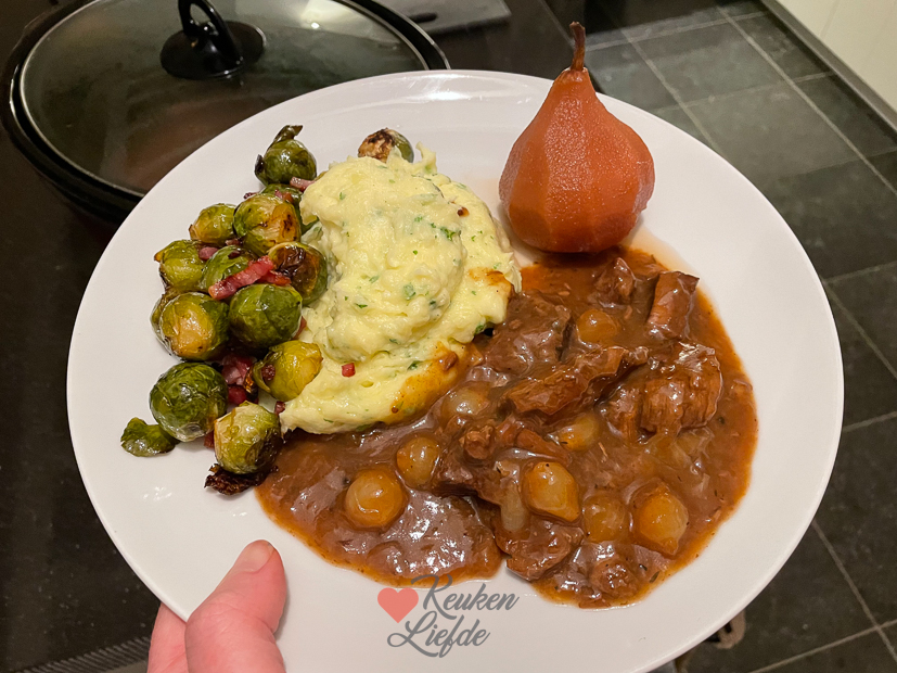 Vandaag weer hetzelfde liedje. Johan ging boven weer aan de slag (was veel meer werk dan we dachten vooral omdat de groene verf er overal zo dik op zit). Ik vermaakte me vooral met de was en het voorbereiden van het avondeten. Op het menu staat stoofvlees (ongeveer dit recept maar dan met appel-, en perenstroop en zilveruitjes in plaats van uien. Ook de bloem laat ik achterwege en bind het vocht op het einde met een maizenapapje. Het vlees bak ik eerst aan in de koekenpan en doe ik daarna in de slowcooker, dan bier, fond en stroop opwarmen in achtergebleven bakvet in koekenpan en gaat dan samen met rest van de ingrediënten in de slowcooker), stoofpeertjes, aardappelpuree en spruitjes met spekjes uit de oven. Eind van de middag maakten Johan en ik nog een grote wandeling met Nacho. Het was superkoud maar toch lekker om er even uit te zijn.