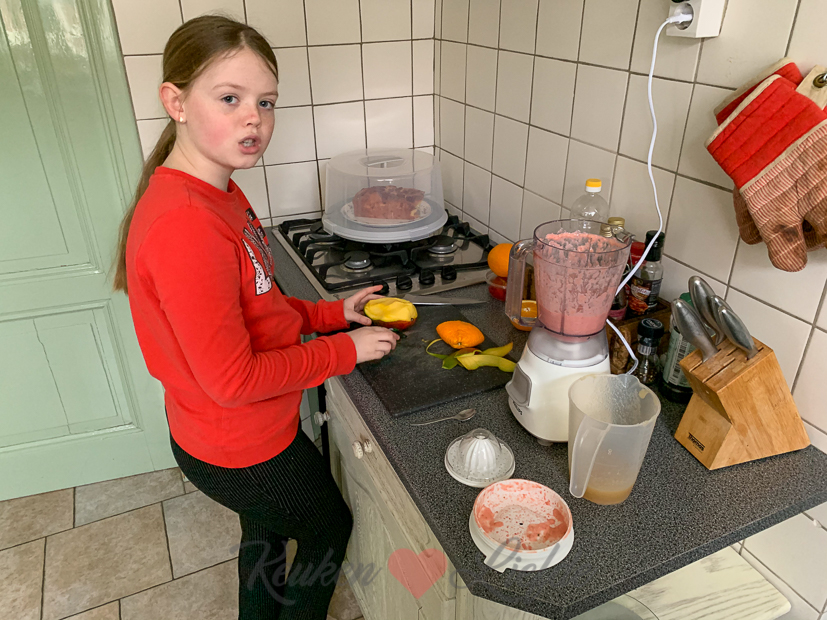 Daarna maakte Ella nog een lekkere smoothie. Nacho hield alles nauwlettend in de gaten. Als Ella-Marie klaar is ga ik de keuken nog even in om een KL-recept voor Pasen te maken.