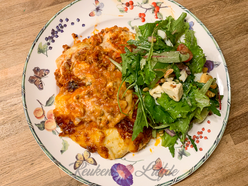 ’s Avonds eten we lasagne, ik had de helft van de bolognesesaus en bechamelsaus die ik vrijdag maakte namelijk bewaard. Een lekkere salade erbij en klaar zijn we weer. Tip! Ik maak één keer per week een jampotje met saladedressing en bewaar die in de koelkast . Zo heb ik altijd zelfgemaakte dressing bij de hand. Voor de dressing vul ik een leeg jampotje met een flinke scheut zoetzuur augurkennat, een druppeltje witte balsamicoazijn, een kneepje honing en een lepeltje mosterd. Deksel erop en flink schudden. Dan dezelfde hoeveelheid extra vierge olijfolie erbij als er vloeistof in het potje zit en weer flink schudden. Even proeven of hij goed is en indien nodig wat zuurder of zoeter maken met azijn, augurkennat of honing. Eventueel op smaak brengen met zout en peper. De ingrediënten voor de salade waren dit keer: zakje slamelange, komkommer, tomaat, rode ui, hardgekookt ei, olijven, feta, pijnboompitten en dille en peterselie.