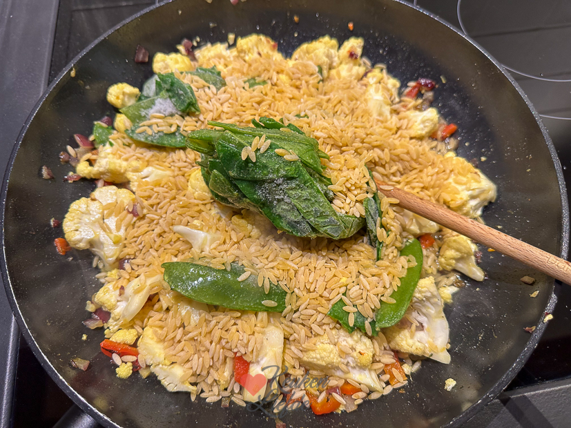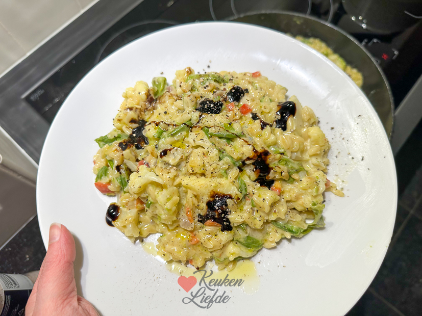 Ella-Marie heeft geluk, want ze worden vandaag naar school gebracht en gehaald. Als iedereen weg is kruip ik op kantoor achter de computer. Halverwege de middag haal ik de pubers uit school. Als iedereen thuis is afgezet gaan Ella en ik nog even naar de bieb en halen we nog wat boodschappen. Weer thuis begin ik meteen aan het avondeten want Ella moet voetballen ’s avonds. Ik flanste een makkelijke eenpanspasta in elkaar met van alles wat ik vond in de koel- en kelderkast. Bloemkool, peulen uit de vriezer, geroosterde paprika uit een pot, risoni, wat parmezaan en gorgonzola, bouillon, scheutje room en een flinke drizzle balsamicostroop om het af te maken. Ziet eruit als derrie maar het smaakte goed!