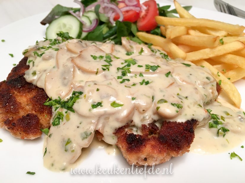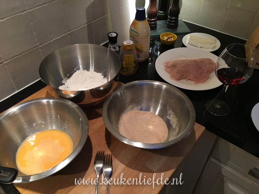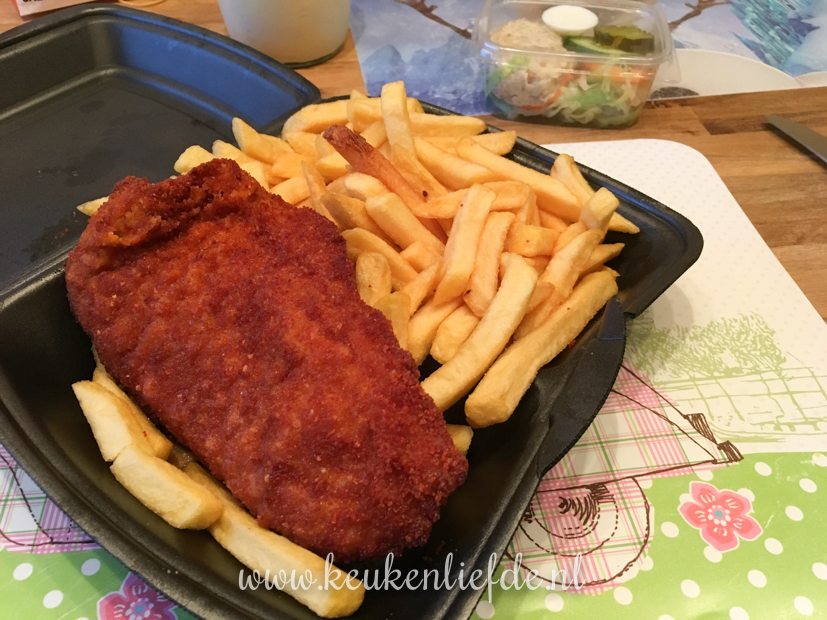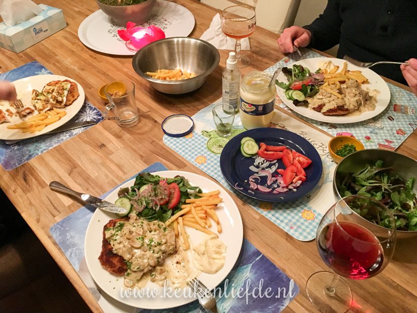 Als we aan het eind van de middag thuiskomen ga ik aan de slag met het avondeten. Ik maak zelf kipschnitzels. Ella-Marie krijgt er één met brie, walnoot en honing en Johan en ik smullen van een kipschnitzel met champignonroomsaus. Erbij eten we ovenfrietjes en sla. Weekendverwennerij!