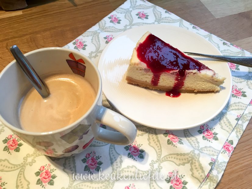 Ik ontbijt met een stukje witte-chocoladecheesecake met frambozensaus swirl (Starbucks copycat!). Het recept ga ik aanstaande zaterdag met je delen, inclusief handige kookvideo. Als je niet zolang wilt wachten, dan is deze cheesecake met frambozensaus ook een aanrader!