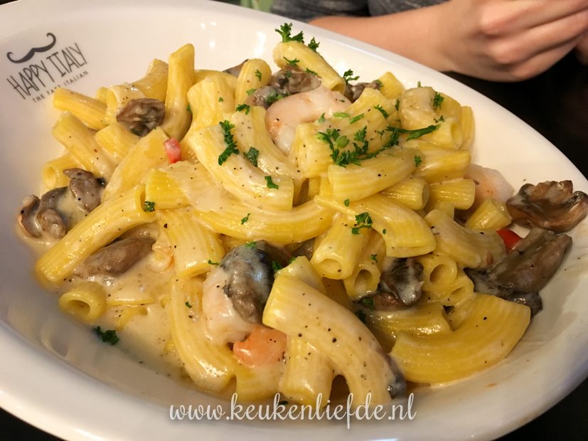 Ik ga ’s avonds met een vriendin in Arnhem naar Soof 2. Daarvoor eten we een hapje bij Happy Italy. Ik ben fan van die tent! Heel erg sfeervol zit je er niet (druk en groot), maar het eten is vers, superlekker en niet duur. Omdat de porties enorm zijn, vraagt de bediening standaard of je een doggybag mee naar huis wilt nemen. Top! Ik kies een pizza met mozzarella, San Daniela ham, rucola en Parmezaan (€ 9,75). Mijn vriendin kiest een pasta met roomsaus, garnalen, Spaanse peper, paddestoelen en peterselie (€ 8,75). Smullen!
