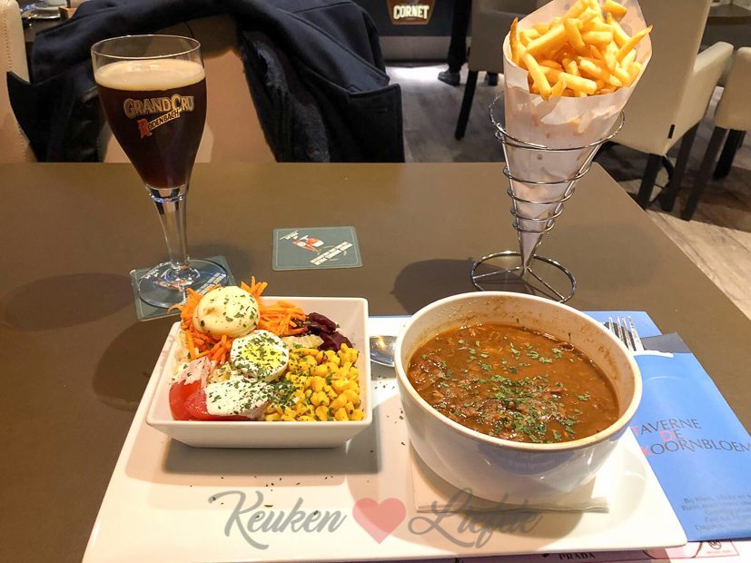 Tegen de tijd dat El op bed ligt en ik — met een warme kersenpit in mijn nek — aan mijn pizza begin is het half tien ’s avonds. Johan stuurt ondertussen deze foto door van zijn avondeten in een Belgisch eettentje. Ziet er ook niet verkeerd uit!