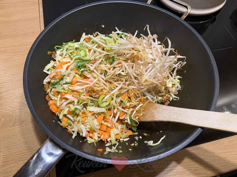 Ella-Marie is naar school, Johan is vrij vandaag en ik werk thuis op kantoor. Tussen de middag lunchen Johan en ik samen met wat opgewarmde kliekjes. Ik had nog een flinke portie gekookte witte rijst in de koelkast staan en daar maak ik ’s avonds nasi van. Ik begin altijd met het fruiten van een uitje, fijngesneden spek of bacon, knoflook, rode peper, trassie, een verkruimelde bouillontablet en sambal manis. Dan de gesneden groenten erbij en meebakken tot ze geslonken zijn. Dan opzij schuiven in de pan en 2 geklutste eitjes erbij, even roeren tot roerei en door de groente mengen. Dan de gekookte rijst erbij en meebakken tot alles door en door warm is. Verder erbij had ik mini loempiaatjes uit de oven, pindasaus en een gebakken ei. Dit is een gerecht waar ik iedereen in huis blij mee maak.