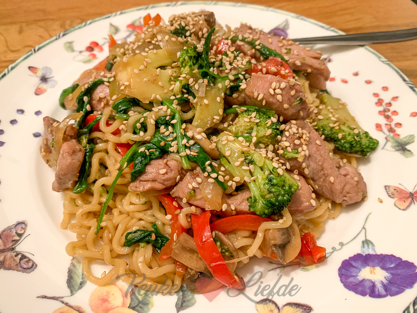 Na het ontbijt ga ik nog even aan de slag op kantoor. Johan rijdt ondertussen naar de IKEA om een kast te halen voor in de keuken. Hopelijk kunnen we volgend jaar een nieuwe keuken uitzoeken maar tot die tijd willen we er ook wel een beetje gezellig bijzitten. En daar is IKEA ideaal voor. ’s Middags wordt Ella weer thuisgebracht en blijft het vriendinnetje nog even gezellig bij ons spelen. Ik vermaak me ondertussen met het uitzoeken van de kerstspullen op zolder; we hebben dozen vol kerstversieringen en ik heb geen idee meer wat er allemaal in die dozen zit. Als ik de strengen met lampjes ga controleren blijkt dat de helft het niet meer doet. Dat ruimt lekker op. ’s Avonds maak ik een makkelijk wokgerecht met noedels met varkenshaas (gemarineerd in sojasaus, knoflook en drupje sesamolie), kliekjes groenten uit de koelkast (champignons, broccoli, spinazie, paprika en ui) en oestersaus.