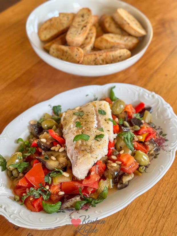 Vandaag staat er een kookdag op de planning met kerstrecepten. Ik maak onder andere lava cakejes, appel kruimel toetjes en aardappel gratins met spinazie en ricotta. De recepten ga ik snel met je delen! M’n moeder had de caponata met vis uit ons kookboek Makkelijke Wereldgerechten gemaakt en stuurde een foto door. Het viel erg in de smaak!