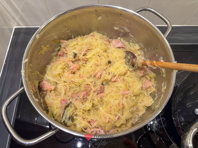 Al tijden had ik zin in zuurkool en vandaag zet ik hem op het menu. Ik stoof de zuurkool heel zachtjes in wijn en tussen de laagjes zuurkool laat ik een stukje zuurkoolspek en casselerrib (deze koop ik bij de Jumbo maar niet elke Jumbo heeft hem) meegaren tot ze heel zacht zijn en uit elkaar vallen. Het vlees roer ik daarna door de zuurkool met een fijngeraspte aardappel om het overige vocht van de zuurkool mee te binden en de zuurkool fluweelzacht en smeuïg te maken. Ik serveer er aardappelpuree, uitgebakken spekjes, een rookworst, ananas en jus bij. Gruwelijk lekker. Op onze IG vind je een reels hoe ik de zuurkool maakte of dit recept.