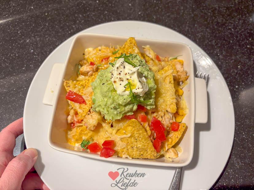 M’n moeder stuurde een foto door van haar avondeten: een vrolijk bordje nasi! Ik maakte ’s avonds voor iedereen een schaaltje loaded nacho’s met gekruide kipfilethaasjes, paprika, mais, bosui en guacamole.
