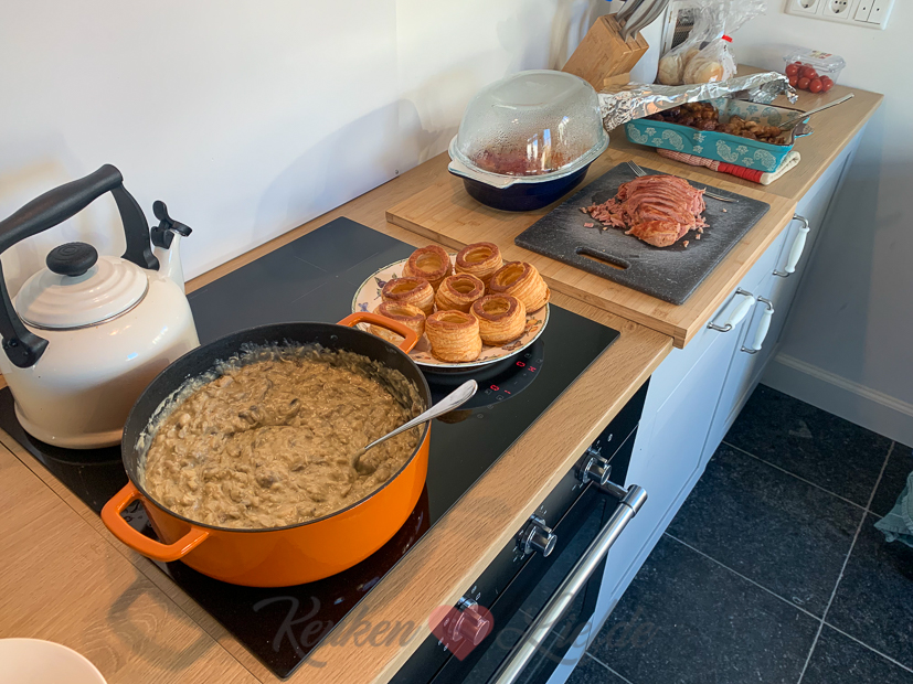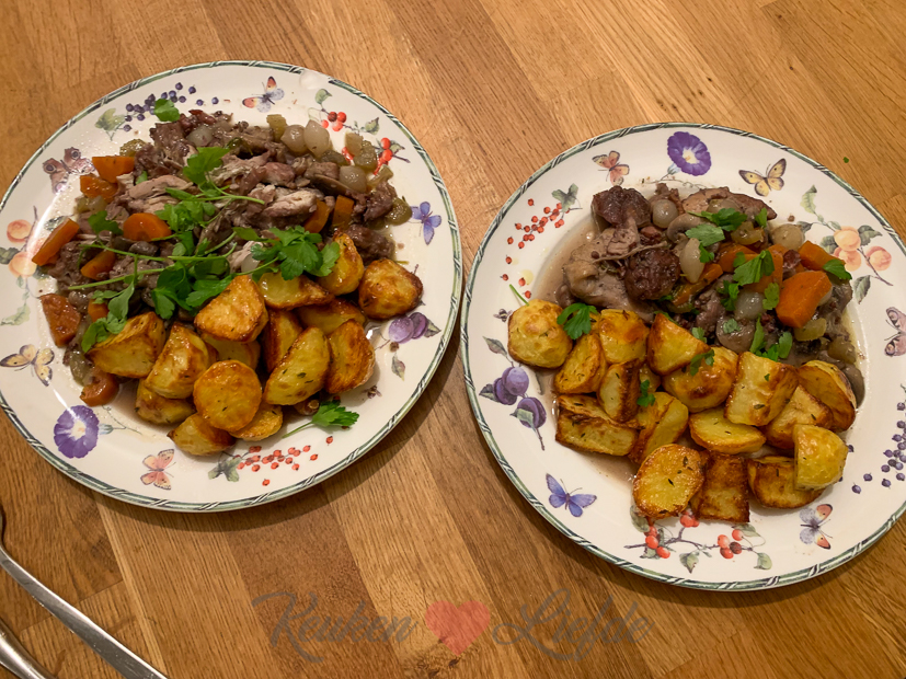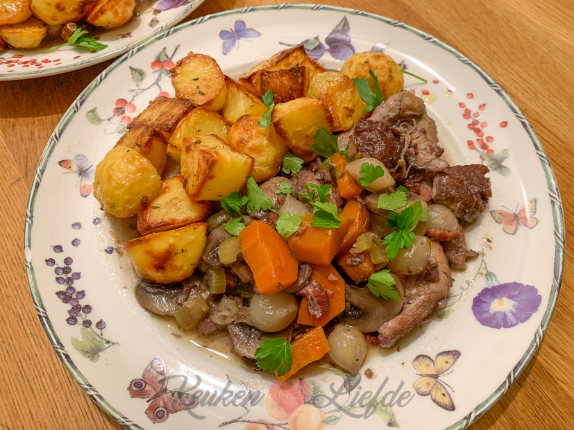 Ella-Marie is nog logeren bij opa en oma en Johan is naar zijn werk, dus ik ben weer een dagje alleen thuis. Vind ik heerlijk hoor, alleen thuiswerken. Ik verzet het meeste werk als er stilte om me heen is. Soms is dat weleens saai, maar over het algemeen vind ik het fijn. Ik ben zowieso een echte huismu(t)s. Werken op kantoor, rommelen in huis of in de tuin, ik vermaak me altijd. Afijn, ik werk de hele dag op kantoor tot Johan ’s avonds weer thuiskomt. Koken hoeft niet want er is nog coq au vin (het recept vind je in het hoogtepunt ‘recepten’ in onze IG feed) van gisteren over die we opwarmen. Erbij bakken we wat aardappeltjes op het bakblik in de oven. Was heerlijk.