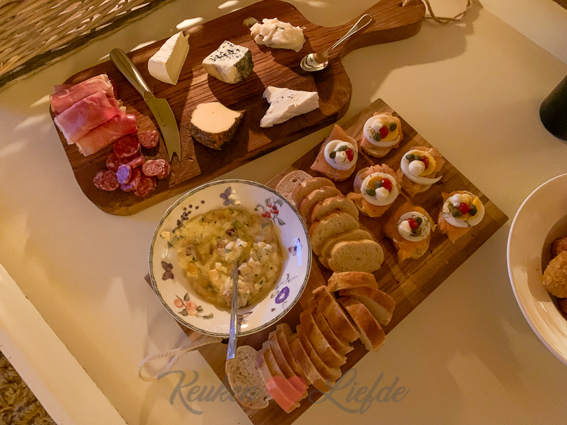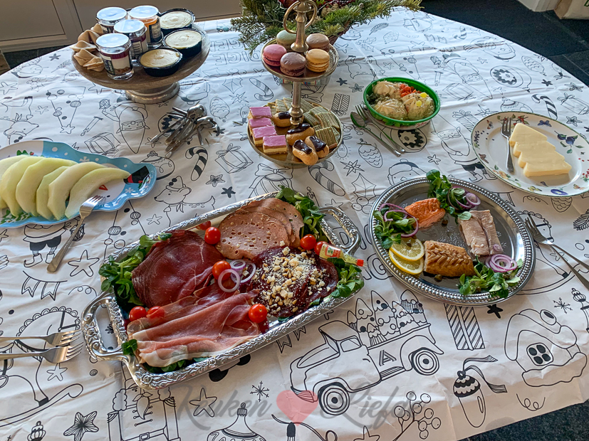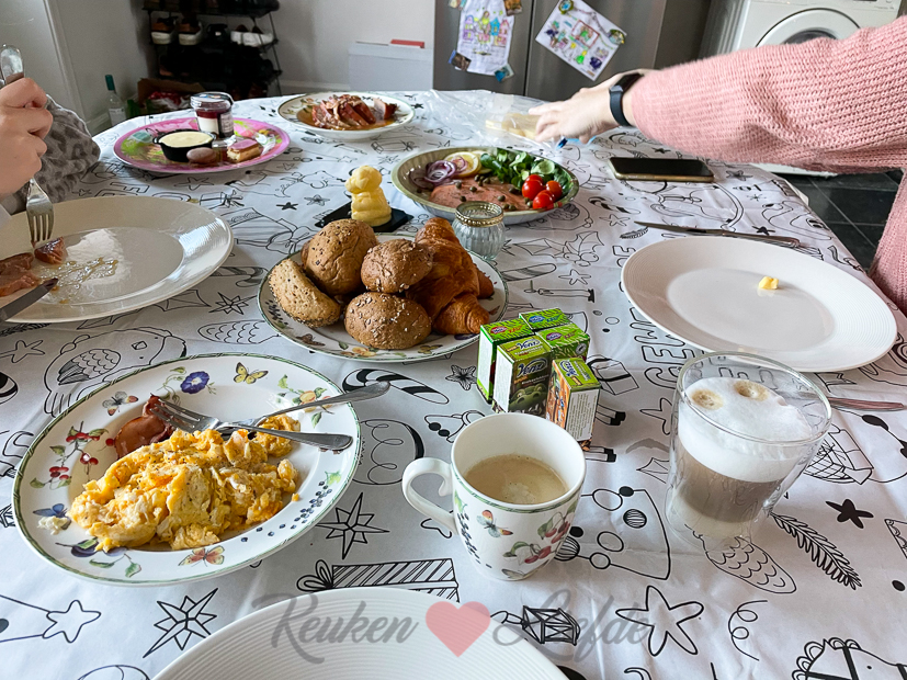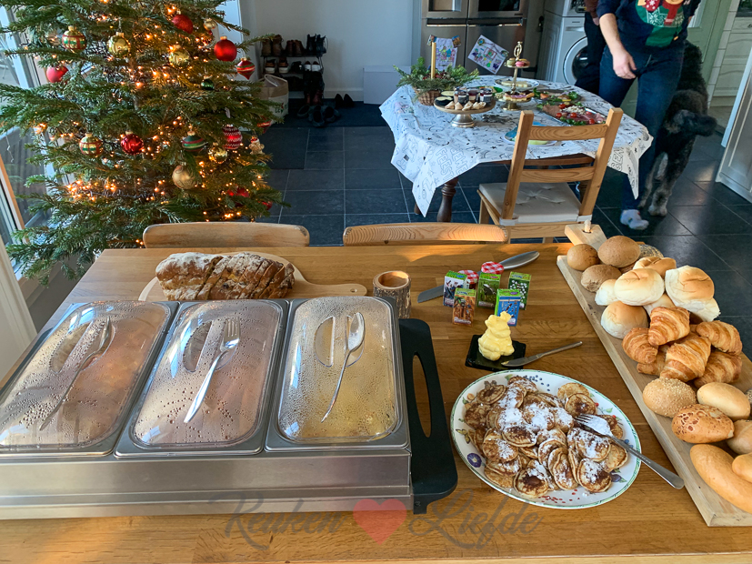 Eerste kerstdag! Aan het eind van de ochtend komen Johan zijn ouders, zusje, zwager en neefje bij ons brunchen. Iedereen had wat meegenomen. Het resultaat was een warm en koud buffet met pasteitjes en kippenragout, beenham uit de oven, warme kiphapjes, aardappelgratin, knakworstjes, bacon, roerei, verschillende mini broodjes, mini croissants en kerststol, hartig en zoet broodbeleg, meloen, kaas, vleeswaren, huzarensalade en als toetje waren er verschillende kleine zoete desserts, macarons en poffertjes. Het was heerlijk en gezellig. ’s Avonds toen iedereen naar huis was, nestelden we ons op de bank met een kerstfilm, wijn en kaas.