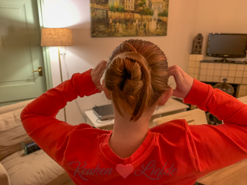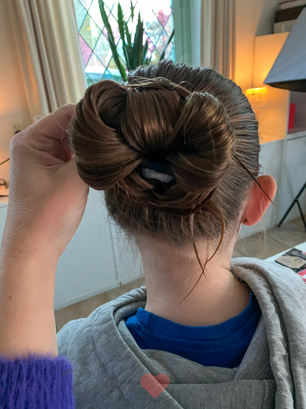 Het haar van Ella-Marie wilde ’s ochtends absoluut niet meewerken en de strik die ik gisteren maakte kreeg ik nu onmogelijk weer gemaakt! Uiteindelijk werd het dus toch weer haasten en maakte ik maar een soort knot met twee sushistokjes erin gestoken… Gelukkig was Ella-Marie er blij mee!