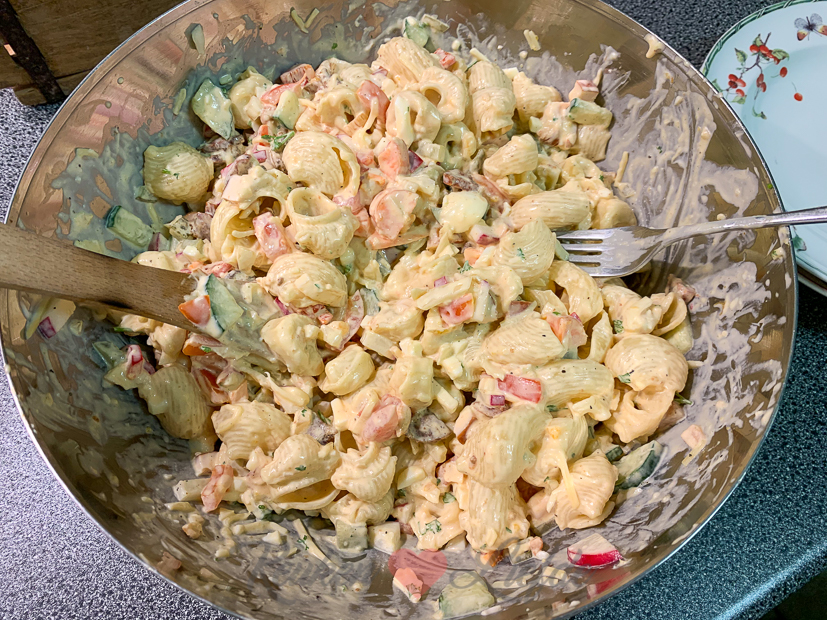 ’s Avonds eten we pastasalade à la Johan waarin hij zich uitleeft met koelkastkliekjes. En die zijn er altijd veel bij ons….