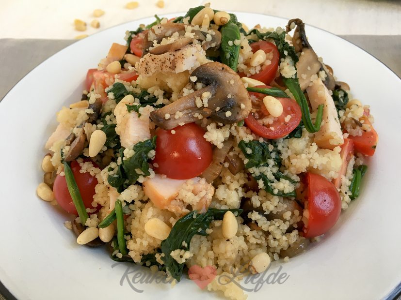 Ik maak couscous voor het avondeten met spinazie, champignons, gerookte kip en cherrytomaatjes. Recept komt eraan!