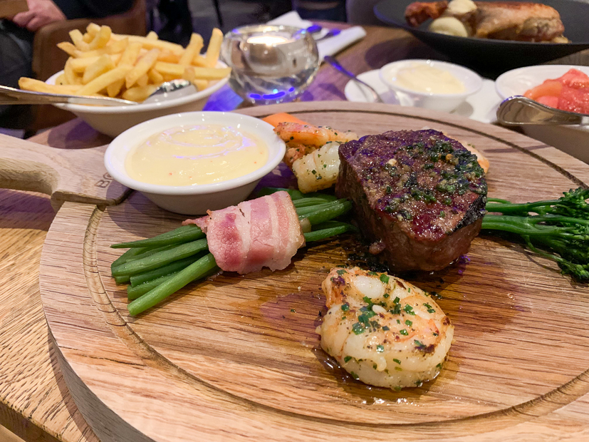 - Als hoofdgerecht ging ik voor de surf & turf en Johan nam de gekonfijte eendenbout met puree en zuurkool. Nom!