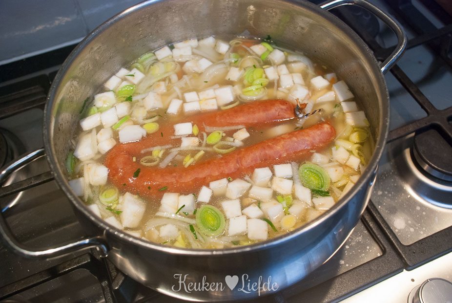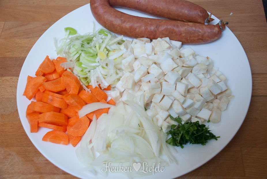 De klassieke soepgroenten – ui, het lichtgroene van de prei, winterwortel en knolselderij – brengen zoetigheid, kruidigheid en die typische erwtensoepgeur. Met groentebouillontabletten maak je snel een hartige basis.