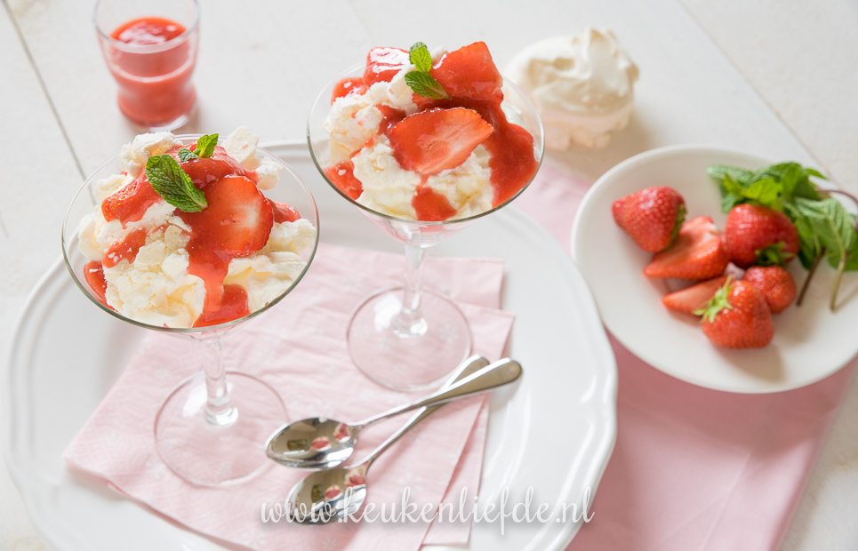 Eton mess is een populair Brits dessert dat uitblinkt in eenvoud. Het bestaat uit slechts drie ingrediënten, namelijk aardbeien, opgeklopte slagroom en meringue schuimpjes. Deze ingrediënten gooi je rommelig in een glas door elkaar en klaar ben je. Tijd om te smullen!