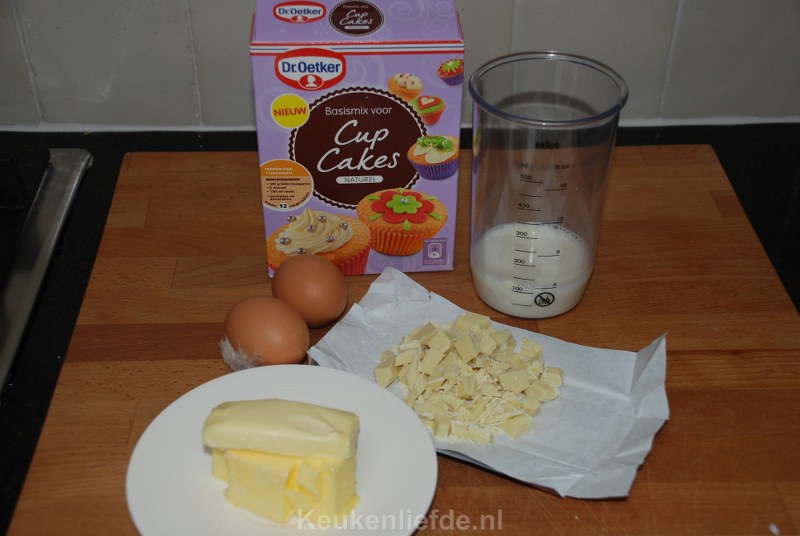 Haal de boter, eieren en melk tijdig uit de koelkast om ze op kamertemperatuur te laten komen. Snij de boter in kleine blokjes. Meet alle ingrediënten van te voren af met een maatbeker of weegschaal en zet ze in aparte kommen klaar voor gebruik. Doe het meetwerk secuur, dit is cruciaal voor een goed cupcake beslag.