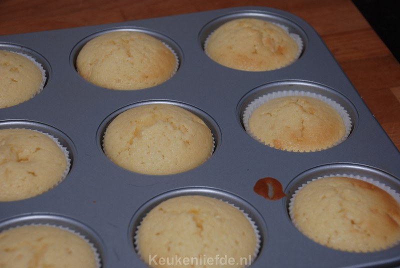 Eenmaal uit de oven laat je de cupcakes even een minuut in het bakblik zitten. Zet het bakblik bij voorkeur even op een rooster. Na een minuut haal je de cupcakes voorzichtig uit het bakblik. Je kunt het bakblik een beetje schuin houden zodat de cupcakes er langzaam uitvallen. Zo hoef je niet aan de papieren bakvormpjes te trekken en laten de papiertjes niet los. De papieren bakvormpjes laat je om de cupcakes zitten. Laat de cupcakes goed afkoelen op een koel rooster.