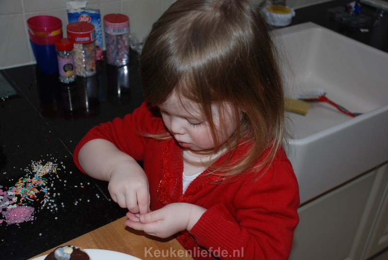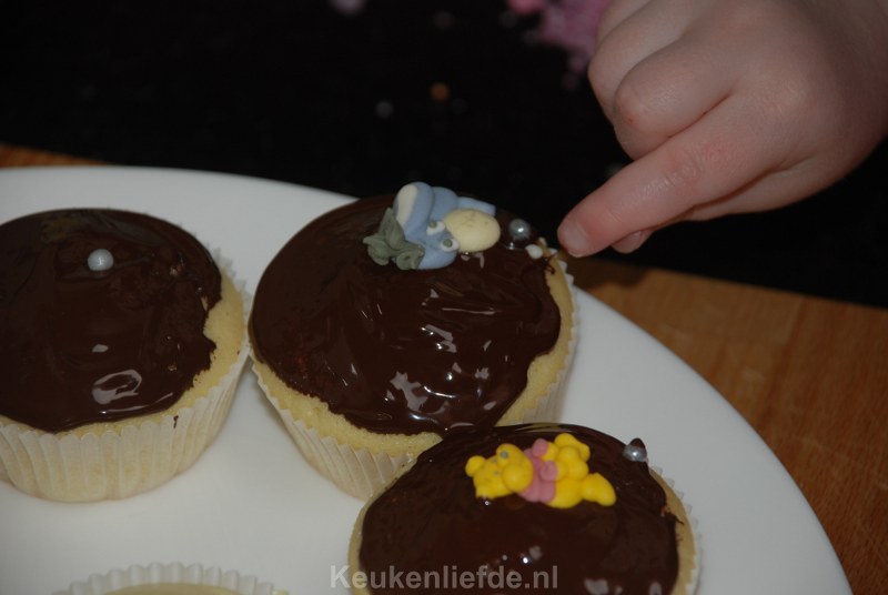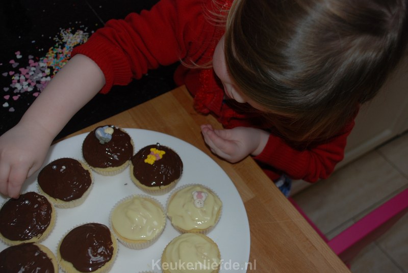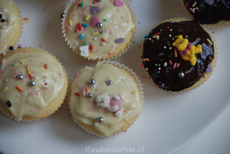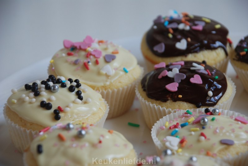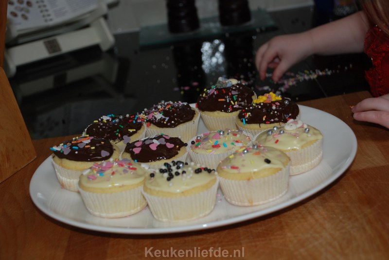 Ik heb dit keer een pak cupcake mix gebruikt van Dr. Oetker omdat dit in mijn kerstpakket zat. Je hoeft hier alleen melk, boter en eieren aan toe te voegen dus…. het pak mix bestaat gewoon uit bloem en suiker met nog wat toevoegingen. DSC_2191_800x536Wanneer je, net als ik, altijd bloem, boter, eieren en suiker in huis hebt kun je de cupcakes ook makkelijk zelf maken. Je kunt eindeloos variëren door vullingen en smaken toe te voegen aan het basisbeslag. Ik voegde bijvoorbeeld gehakte stukjes witte chocolade toe aan het beslag en decoreerde de afgekoelde cupcakes met gesmolten witte en pure chocolade en bestrooide dit met verschillende eetbare decoraties. DSC_2188_800x536Hoewel ik ze dit keer dus uit een pak maakte (en ik moet zeggen dat ze best lekker zijn) zet ik hieronder een recept om ze helemaal zelf te maken. Het recept heb ik van cupcakerecepten.nl.