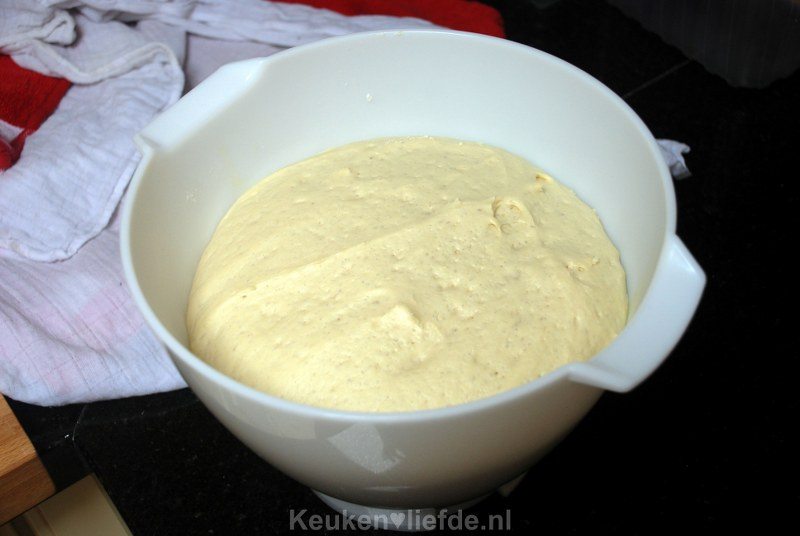 Doe de zakjes gist in 300 ml warm water en laat enkele minuten staan totdat het gaat schuimen. Gebeurt dit niet, dan is de gist dood en werkt het niet meer. Gooi het gistmengsel dan weg en maak het opnieuw.