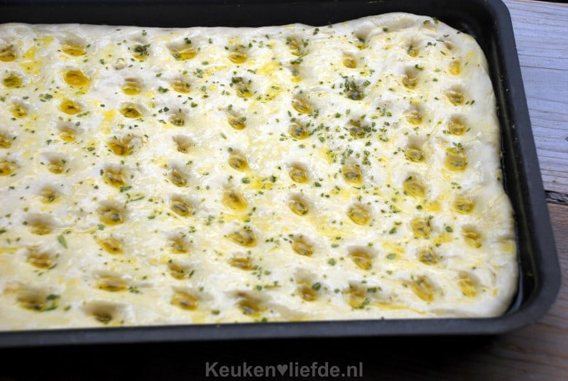Bak de focaccia circa 30 minuten in de oven, of totdat de bovenkant goudbruin is.