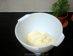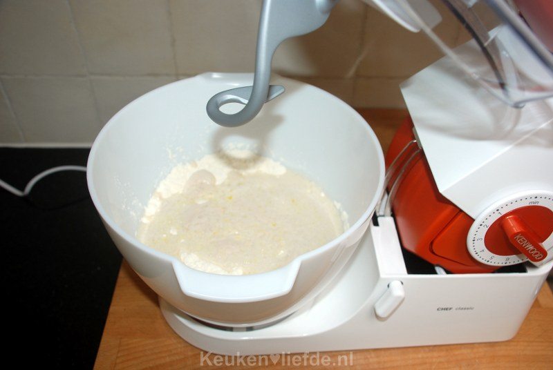Voeg het gistmengsel samen met de overige ingrediënten in de keukenmachine en meng circa 10 minuten tot een gladde bal die loslaat van de kom. Je kunt het kneden ook met de hand doen.