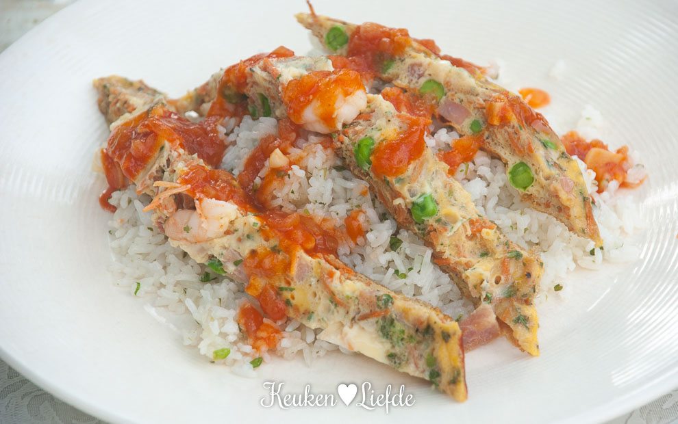 Afhaalchinees is voor ons pas compleet met foe yong hai: omelet met groenten in een zoet-zure, rode saus.