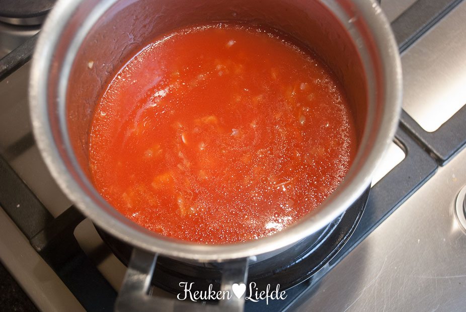 Fruit de ui en knoflook in wat olie, totdat ze zacht zijn. Voeg de ketchup, gembersiroop, azijn en 100 ml water toe en laat de saus op laag vuur zachtjes pruttelen, totdat hij wat dikker is. (Indien gewenst kun je de saus ook iets verdikken met een maizenapapje.)