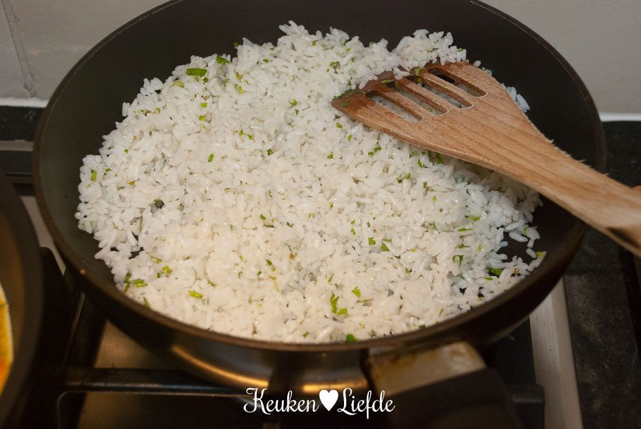 Bak ondertussen, in de andere koekenpan, de rijst in wat olie. Roer op het laatste moment de overige koriander door de rijst.