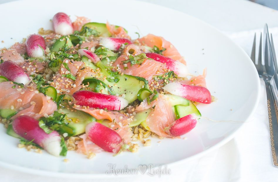 Schep de Freekeh op twee borden en verdeel de gemarineerde komkommer, radijsjes, gerookte zalm, peterselie, sesamzaadjes en hennepzaad eroverheen. Besprenkel met het marinadevocht van de komkommers en breng op smaak met zout en peper.