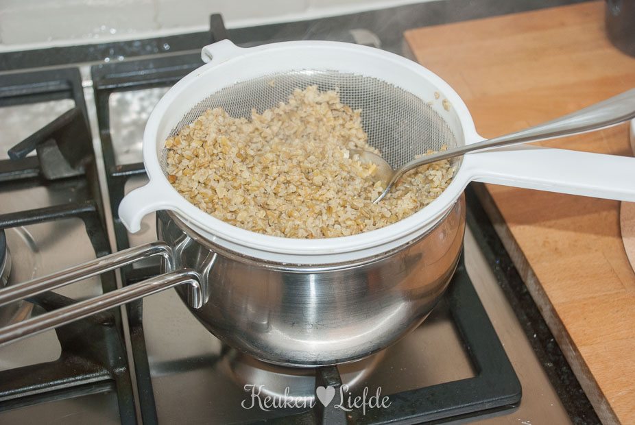 Giet de Freekeh af en laat goed uitlekken in een zeef.
