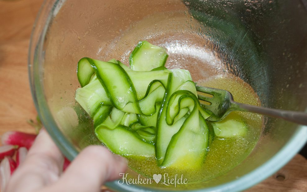 Schil ondertussen de komkommer met de dunschiller, over de lengte in lange plakken (de waterige zaadlijsten gooi je weg). Leg de komkommerlinten in een kom en schenk er wat sushi-azijn en olijfolie overheen, genoeg om de komkommers te marineren.