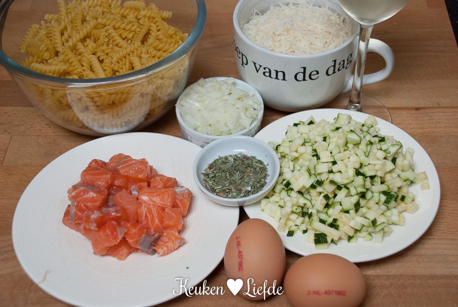 Breng een pan met water aan de kook voor de pasta. Verhit de koekenpan met een flinke scheut olijfolie en en fruit op laag vuur de ui, courgette en Italiaanse kruiden, totdat de groenten zacht zijn. Breng goed op smaak met zout en peper. Kook ondertussen de fusilli beetgaar en giet af, vang een kopje van het kookvocht op. Roer de eieren en Parmezaan in de mengkom los en breng op smaak met peper en zout. Voeg de fusilli aan het eimengsel toe en hussel goed door, totdat de kaas volledig is opgelost en het eimengsel is getransformeerd in een fluweelzachte, romige saus. Ik voegde tijdens het omhusselen wat van het opgevangen kookvocht toe om de saus smeuïger te maken. Bestrooi de zalmblokjes met zout en peper en voeg ze toe aan de courgettesaus, zet het vuur uit. De restwarmte in de pan is voldoende om de zalmblokjes te garen. De zalm mag vanbinnen nog iets rauw zijn als je opschept, want hij gaart tijdens het eten nog door op je bord.