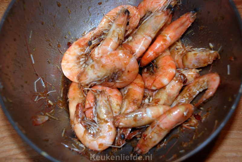 Zet een aantal bakjes water op tafel met wat citroensap erin om de handen mee af te spoelen. Het pellen van de gamba’s is namelijk een kliederige maar gezellige bende!