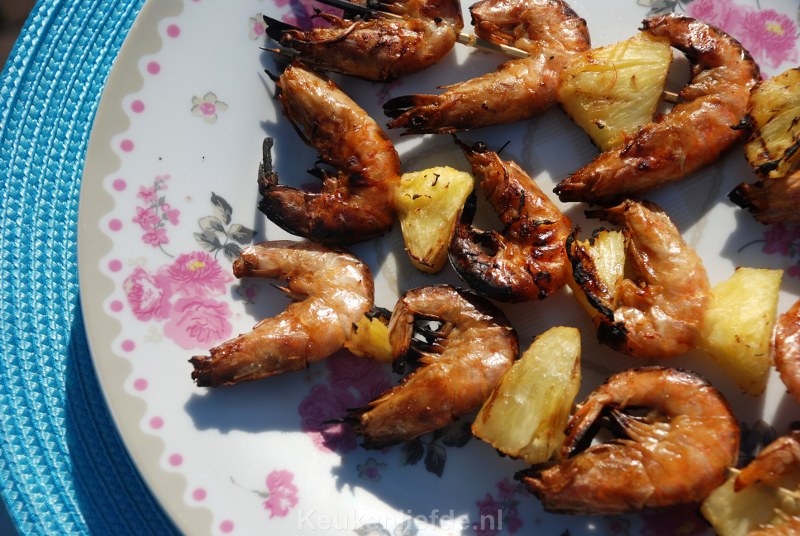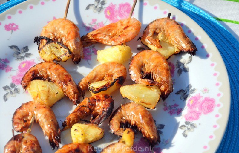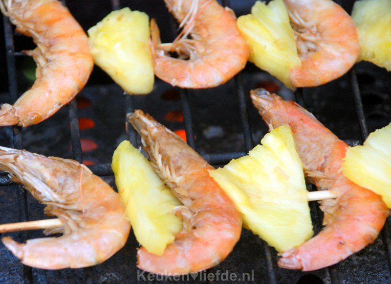 Rijg de gamba’s om en om met de ananas aan de satéprikkers en grill ze op de barbecue totdat ze gaar zijn.
