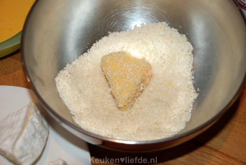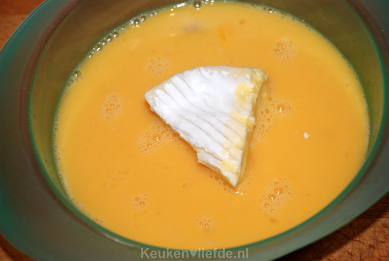 Zet twee diepe bakjes klaar; één met ei en één met panko. Snijd de camembert in punten en wentel ze eerst door het ei en daarna door het paneermeel.