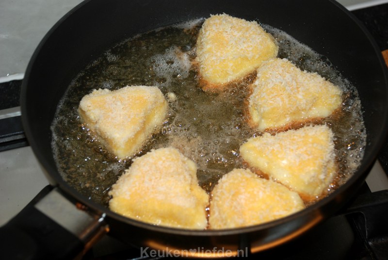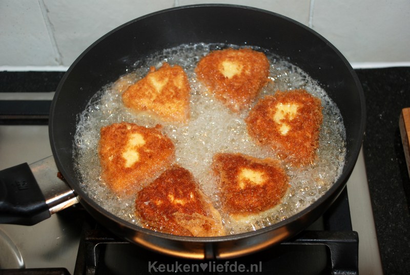 Verhit in een koekenpan een ruime laag olie en bak de camembertpuntjes aan iedere kant ongeveer 1 à 2 minuten, of totdat ze goudbruin zijn en de kaas vanbinnen gesmolten is.