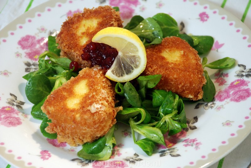 Hoewel ik geen groot liefhebber ben van camembert – ik vind de smaak te sterk -, vind ik deze gebakken camembert met smeltende kern en knapperig, krokant korstje echt verrukkelijk! Serveer de gebakken camembertpuntjes op een bedje van veldsla en schep er een flinke lepel preiselbeerencompote bij. Op de Duitse kerstmarkten wordt gebakken camembert met preiselbeeren vaak als hartige snack verkocht en vaak geserveerd met driehoekjes geroosterd casinobrood.