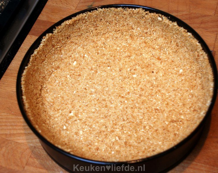 Smelt de boter in een pannetje. Vermaal de biscuits in de keukenmachine fijn en roer ze door de gesmolten boter. Vet de bakvorm in en bekleed de bodem met bakpapier. Doe de koekkruimels in de bakvorm en druk ze met een lepel op de bodem en tegen de rand aan.