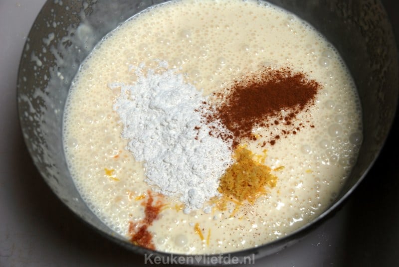Roer de bloem, kaneel, citroenrasp en vanille-extract erdoor.