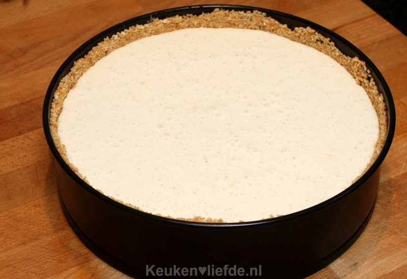 Schenk het kwarkmengsel over de koekjesbodem en zet de vorm in de oven.