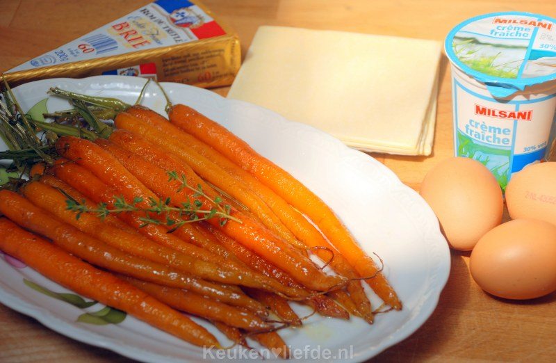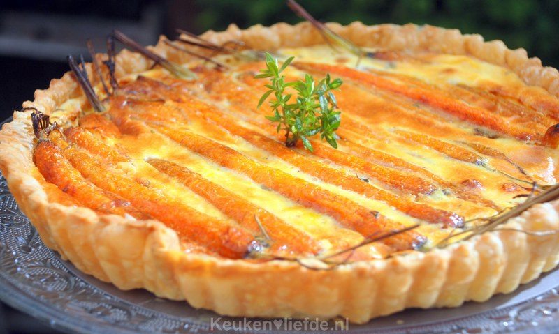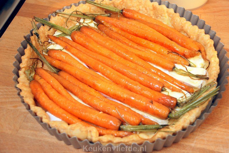 Dit keer geen gekarameliseerde knoflooktaart van Ottolenghi, maar een geglaceerde worteltaart van Annemiek. Ik gebruik in dit recept brie omdat ik die nog had liggen. Je zou echter ook prima een zacht en romig (honing) geitenkaasje kunnen gebruiken. Beide kaasjes combineren verrukkelijk met de zoete, geglaceerde wortels.