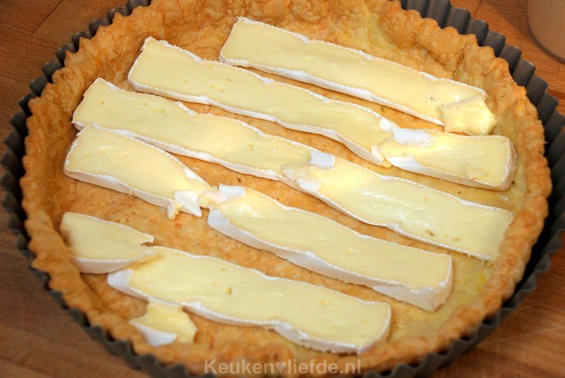 Klop de eieren los met de crème fraîche en tijmblaadjes en breng op smaak met zout en peper. Snijd de brie in lange plakken en leg deze op de bodem van de voorgebakken taartbodem.
