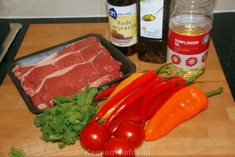 - 3 kleine puntpaprika’s (geel, oranje en rood)