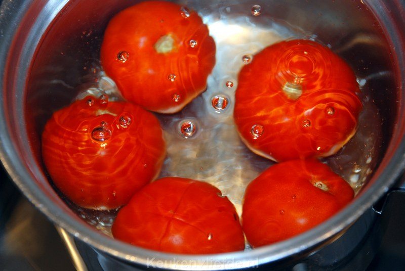 Hak de paprika’s en pepers fijn. Kerf een kruisje in de bovenkant van de tomaten en dompel ze enkele seconden onder in kokend water, niet te lang anders wordt het snot.